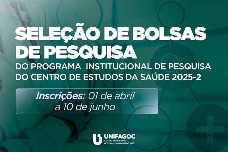 No período de 01 de abril a 10 de junho estarão abertas as inscrições para seleção de bolsas de pesquisa do Programa Institucional de Pesquisa do Centro de Estudos da Saúde do UNIFAGOC, administrado pela Diretoria do Centro de Estudos da Saúde do Centro Universitário Governador Ozanam Coelho, com previsão de início de vigência das bolsas em 01 agosto de 2025.