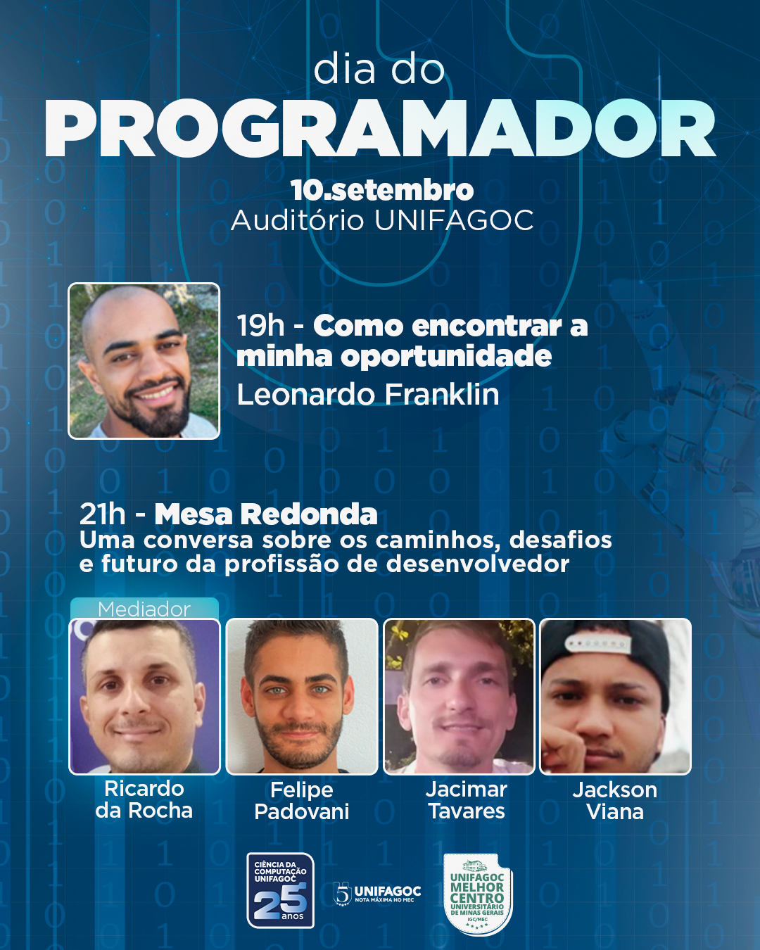 No UNIFAGOC, a comemoração já é tradição. Em 2025, o curso de Ciência da Computação vai antecipar as celebrações com evento especial no dia 10 de setembro, às 19h, no Auditório Ary Barroso.
