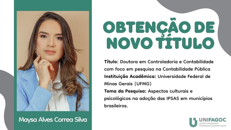 A professora Maysa Alves Correa Silva, docente do curso de Ciências Contábeis do UNIFAGOC, acaba de alcançar marco notável em sua trajetória acadêmica: a conquista do título de doutora em Controladoria e Contabilidade pela Universidade Federal de Minas Gerais (UFMG). A nova titulação representa não apenas a culminância de anos de dedicação, mas também importante contribuição para a área da Contabilidade Pública no Brasil.