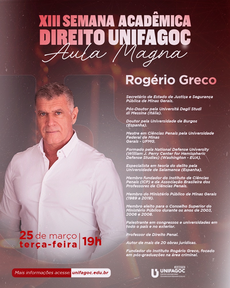 O curso de Direito do Centro Universitário UNIFAGOC reafirma seu compromisso com a formação de excelência ao trazer, para a abertura da XIII Semana Acadêmica do Direito, um dos mais respeitados juristas do Brasil. Rogério Greco, Secretário de Estado de Justiça e Segurança Pública de Minas Gerais, ministrará a Aula Magna do evento na terça-feira, 25 de março, no Auditório Ary Barroso, às 19h.