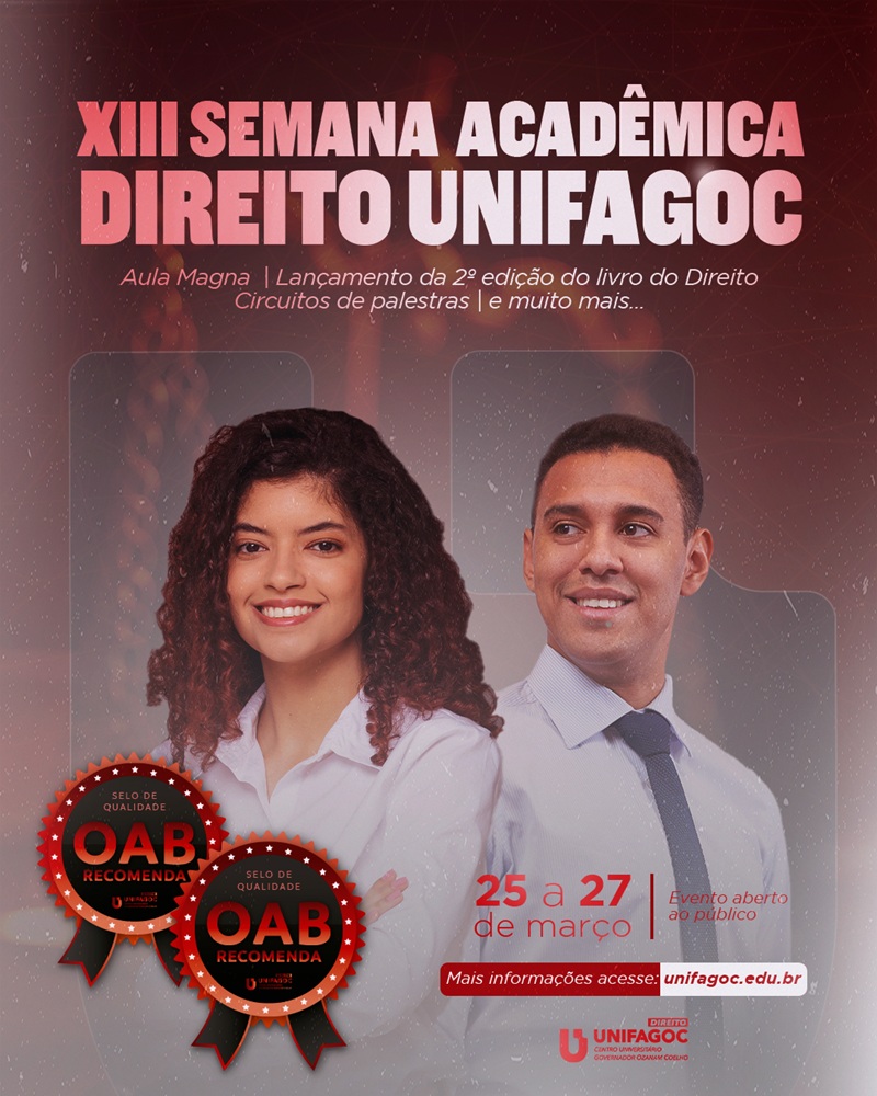 O evento é exclusivo para os alunos da graduação em Direito do UNIFAGOC inscritos previamente na programação da Semana Acadêmica do curso. Todas as vagas já estão esgotadas.