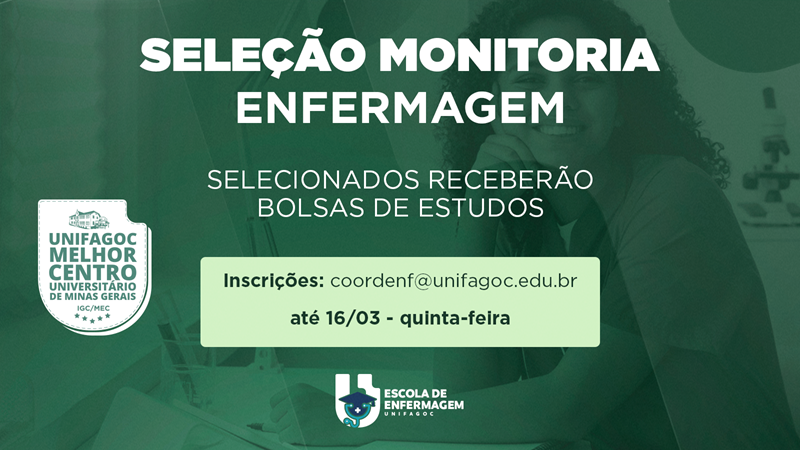 Os candidatos devem realizar a inscrição por meio do e-mail coordenf@unifagoc.edu.br até às 23h59 do dia 16 de março. No assunto do e-mail candidato deve colocar: MONITORIA EM ENFERMAGEM.