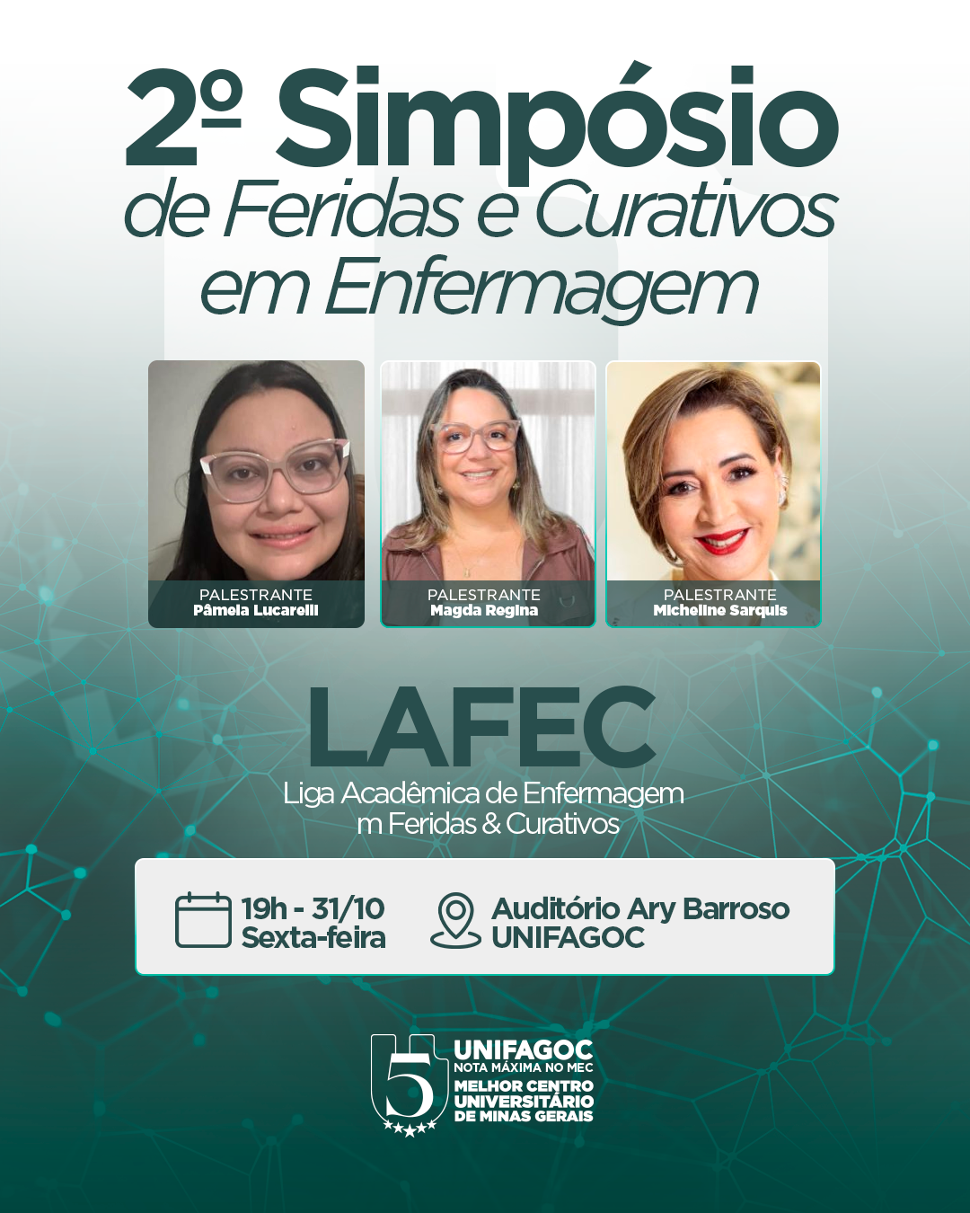 A Liga Acadêmica de Feridas e Curativos (LAFEC) do curso de Enfermagem do UNIFAGOC promoverá, na sexta-feira, 31 de outubro, o 2º Simpósio de Feridas e Curativos em Enfermagem.
