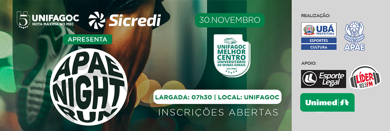 A APAE Night Run 2025 será realizada no dia 30 de novembro, em Ubá, com promoção do UNIFAGOC em parceria com a Prefeitura Municipal de Ubá, por meio da Secretaria Municipal de Cultura, Turismo e Lazer, e Sicredi.