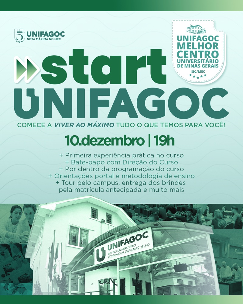 Comece a viver o máximo de tudo o que temos para você! O UNIFAGOC realizará na terça-feira, 10 de dezembro, o Start UNIFAGOC, encontro que marca o primeiro contato dos futuros estudantes com o ambiente acadêmico. A atividade será realizada no campus, às 19h.