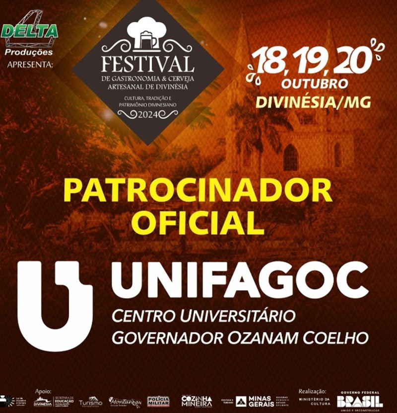 O Centro Universitário UNIFAGOC é patrocinador oficial da 6ª edição do Festival de Cultura, Gastronomia e Cerveja Artesanal de Divinésia, que acontecerá nos dias 18, 19 e 20 de outubro de 2024.