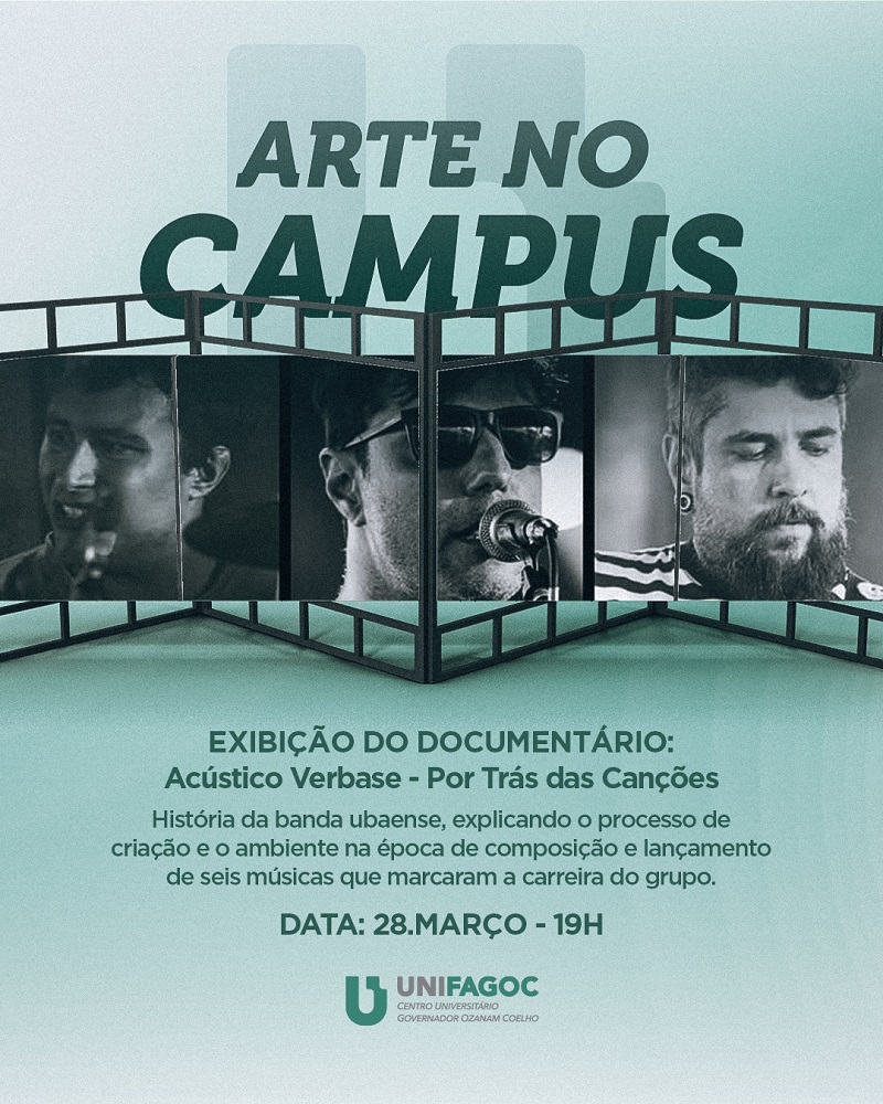 O UNIFAGOC promove nesta sexta-feira, 28 de março, às 19h, na sala 41, campus da instituição, a exibição do documentário “Acústico Verbase: por trás das canções” A sessão é uma ação do projeto Arte no Campus, que tem como objetivo incentivar a produção artística e valorizar a cultura local. A iniciativa é aberta à participação dos alunos de todo os cursos. Haverá emissão de certificado de horas complementares.