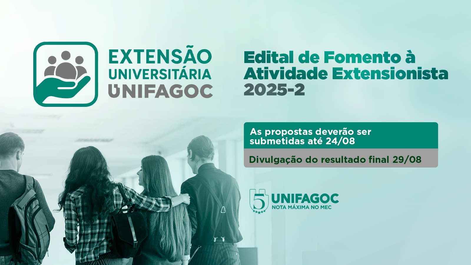 O UNIFAGOC está com inscrições abertas, de 5 a 24 de agosto de 2025, para seleção de propostas de ações extensionistas – curricularizadas ou não – a serem desenvolvidas no 2º semestre letivo de 2025.