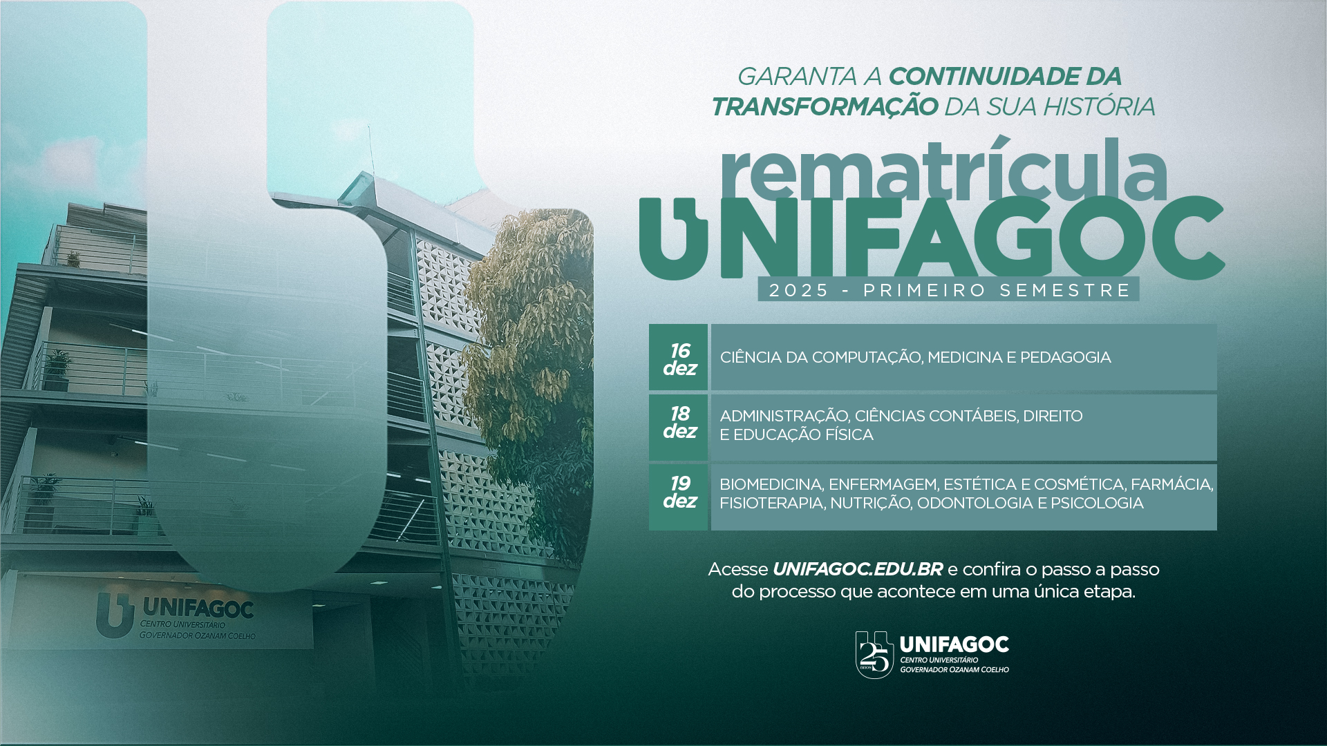 Está na hora de se planejar para a renovação da matrícula para o primeiro semestre de 2025 no Portal do Aluno UNIFAGOC. Os acadêmicos devem seguir o cronograma abaixo, realizar a rematrícula e se preparar para o início das aulas.