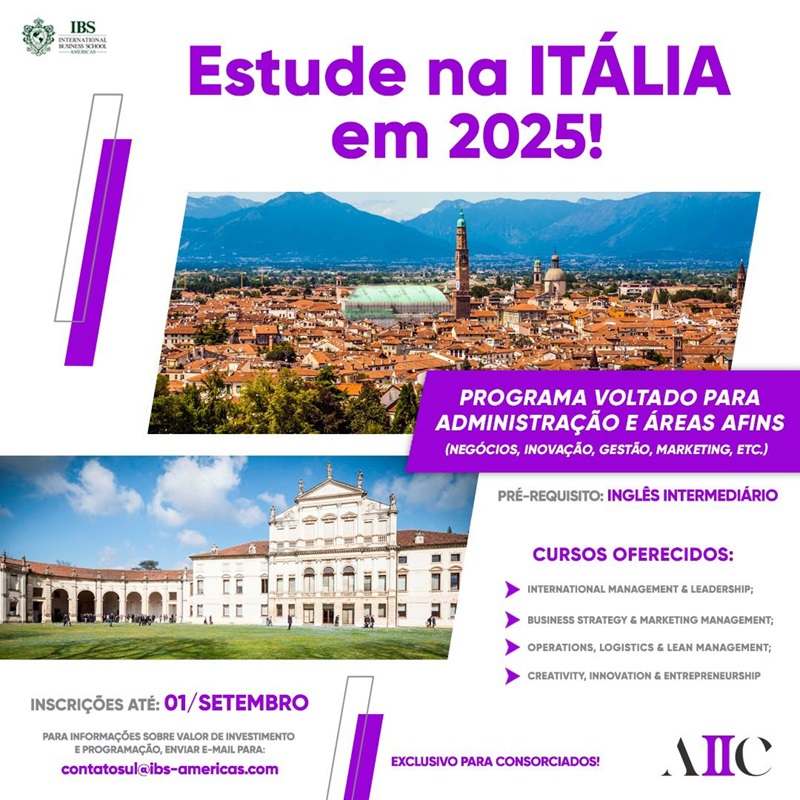 A Associação Internacional de Intercâmbio Cultural (AIIC), em parceria com a International Business School (IBS), está com inscrições abertas para o Programa Parcial de Bolsas, que oferece uma oportunidade única de estudos na CUOA Business School, localizada na Itália.
