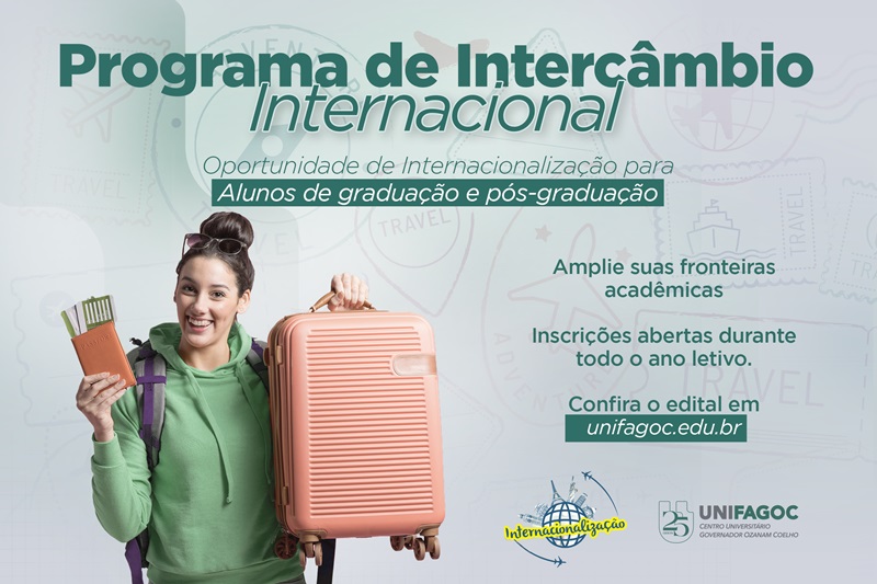 Estão abertas as inscrições para a seleção de alunos de graduação e pós-graduação do UNIFAGOC para concorrerem a bolsas de incentivo à internacionalização do Programa de Intercâmbio Internacional da Instituição.