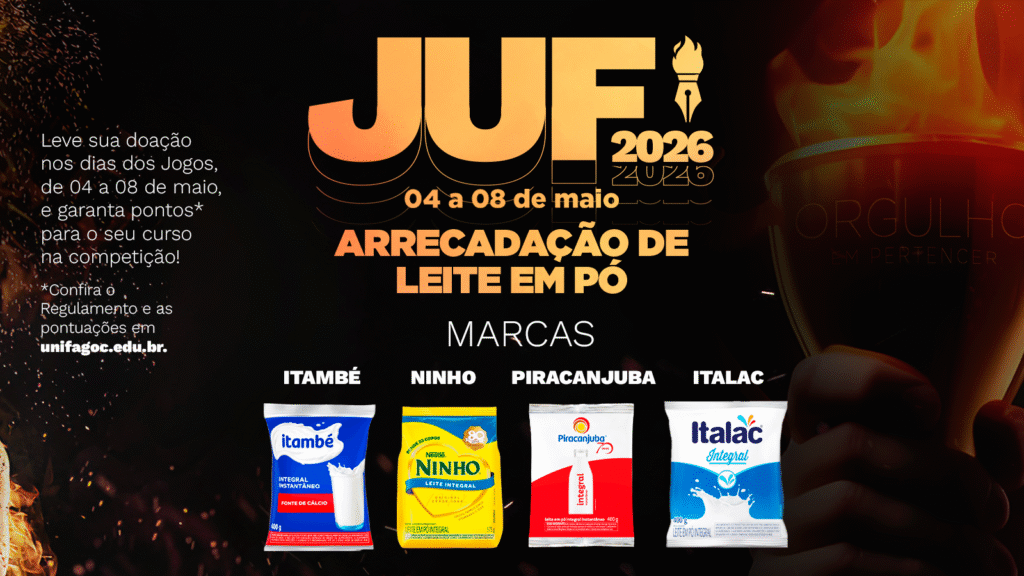 A Comissão Organizadora dos Jogos Universitários UNIFAGOC 2026 divulga a ação social desta edição do evento. Neste ano, a mobilização será voltada à arrecadação de leite em pó, que será destinado ao Banco de Alimentos de Ubá, entidade que atende uma demanda contínua de fornecimento de cestas básicas para famílias carentes da cidade.