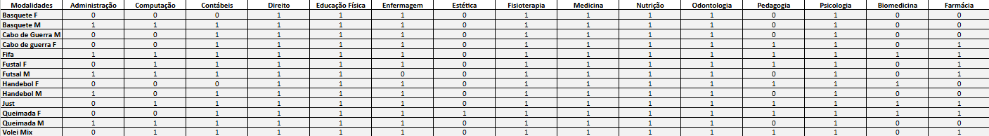 Todas as atléticas realizaram suas inscrições em pelo menos uma das modalidades da competição. No documento de homologação, as caixas marcadas com “1” indicam que a atlética está inscrita na respectiva modalidade; já as marcadas com “0” indicam ausência de inscrição naquela modalidade. Veja a tabela abaixo ou acesse o documento AQUI.