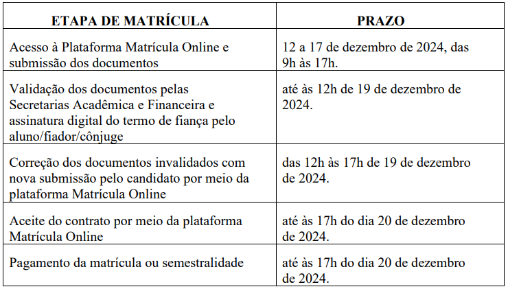 Os candidatos aprovados e convocados deverão acessar a plataforma MATRICULAR AGORA, disponível no endereço eletrônico, disponível AQUI, entre os dias 12 e 17 de dezembro de 2024, no horário das 9h às 17h. Ao acessar a plataforma on-line, os candidatos deverão realizar o upload na plataforma dos seguintes documentos: