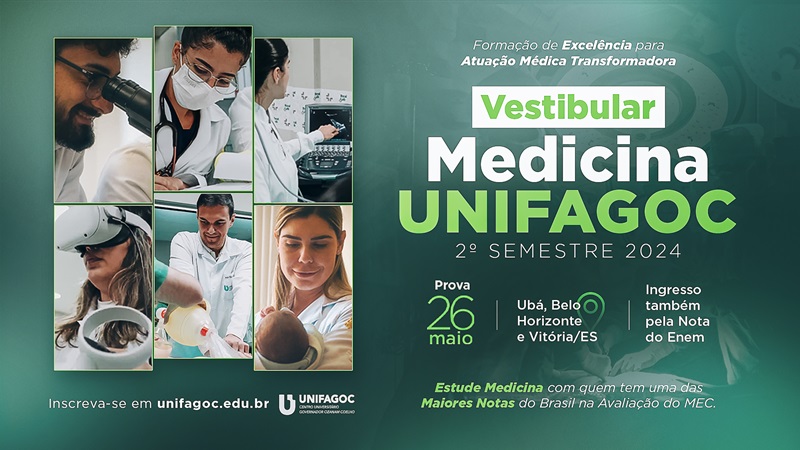 O UNIFAGOC divulga que estão abertas as inscrições para o Vestibular de Medicina para o segundo semestre de 2024. Neste processo, a seleção será feita por meio de prova presencial, aplicada no dia 26 de maio (domingo), simultaneamente em Ubá/ MG, Belo Horizonte/MG e Vitória/ES e/ou por meio da nota do Enem das edições de 2018 a 2023.