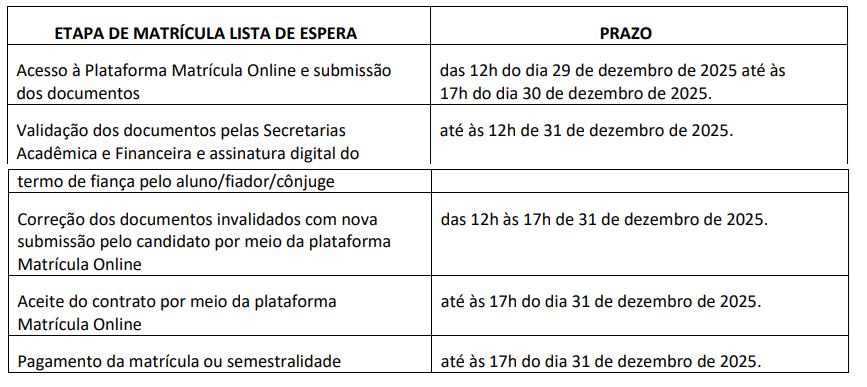 Confira na tabela abaixo as etapas e os prazos da matrícula resumidos: