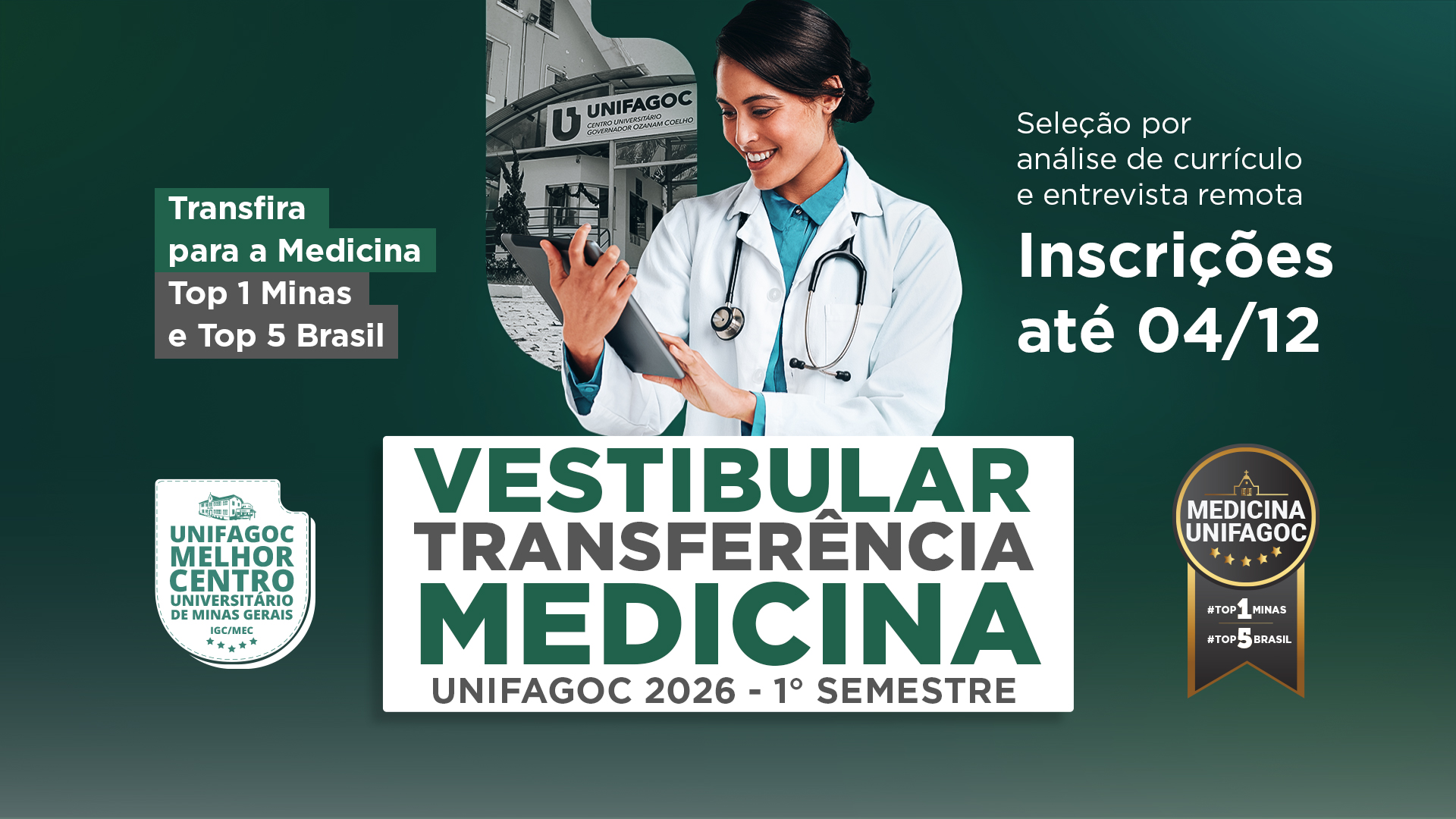 Processo seletivo de Transferência da Medicina UNIFAGOC 2026-1 está com inscrições abertas; estude na TOP 1 Minas e TOP 5 Brasil