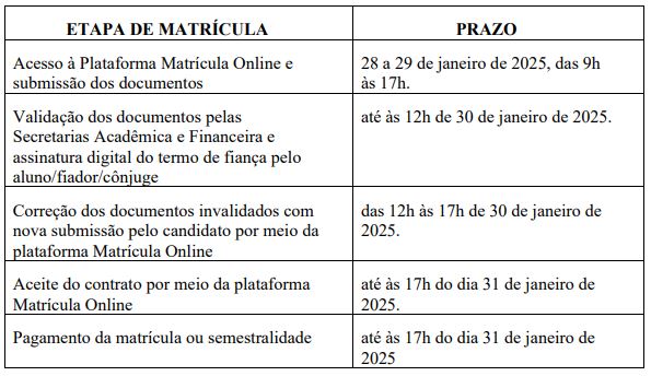 Os aprovados e convocados para realização da matrícula deverão acessar a plataforma MATRICULAR AGORA, disponível AQUI, entre os dias 28 e 29 de janeiro, no horário das 9h às 17h. Ao acessar a plataforma on-line, os candidatos deverão realizar o upload na plataforma dos seguintes documentos: