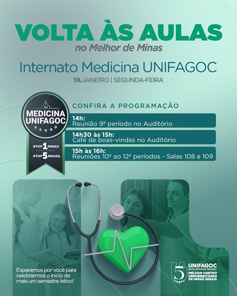 A recepção dos alunos acontecerá no dia 19 de janeiro, segunda-feira, no campus do UNIFAGOC, e será voltada aos acadêmicos dos períodos finais do curso, que vivenciam uma das etapas mais decisivas da graduação em Medicina.