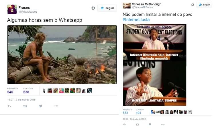 As notícias sobre a limitação da internet banda larga e o bloqueio temporário do aplicativo WhatsApp causaram um "alvoroço" na web. Os internautas se manifestaram sobre as medidas e o resultado disso foram posts engraçados e gifs que brincavam com a situação.