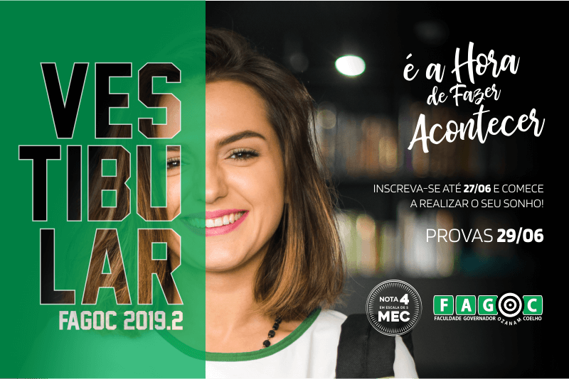 É a hora de fazer acontecer! Inscrições abertas para o Vestibular da Fagoc. Para o segundo semestre são oferecidas vagas para os cursos de Administração, Ciência da Computação, Ciências Contábeis, Direito, Educação Física (BachareladoLicenciatura), EnfermagemEstética e Cosmética, Odontologia (diurno e noturno), Pedagogia, Psicologia.