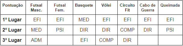 No placar geral, Educação Física ficou em primeiro lugar, seguido de Direito na vice liderança e Medicina na terceira colocação.