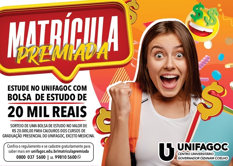 Dúvidas podem ser esclarecidas no site unifagoc.edu.br/matriculapremiada, pelo telefone 0800 037 5600 ou pelo whatsapp (32) 998105600