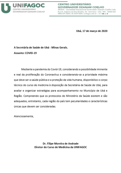 Em virtude da pandemia do Coronavírus, o diretor do curso de Medicina do UNIFAGOC, doutor Filipe Moreira de Andrade, divulgou um memorando no qual coloca o corpo técnico da graduação à disposição para ajudar no enfrentamento do vírus em Ubá. Confira AQUI.