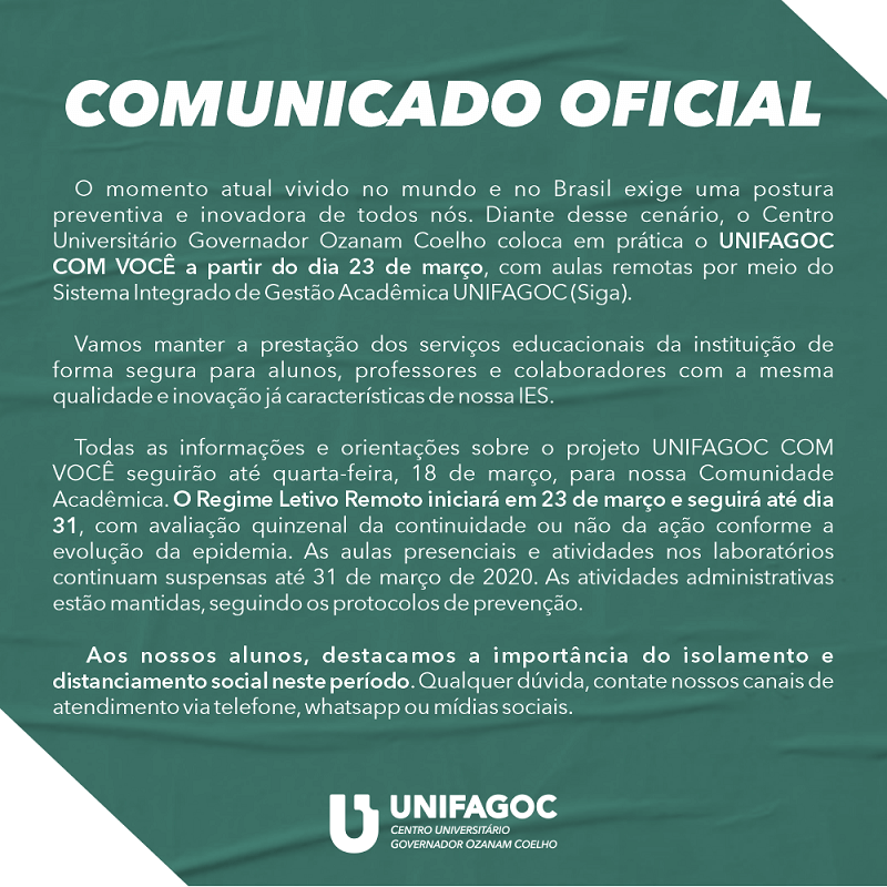 Diante desse cenário, o centro universitário coloca em prática o UNIFAGOC COM VOCÊ a partir do dia 23 de março, com aulas remotas por meio do Sistema Integrado de Gestão Acadêmica (Siga).