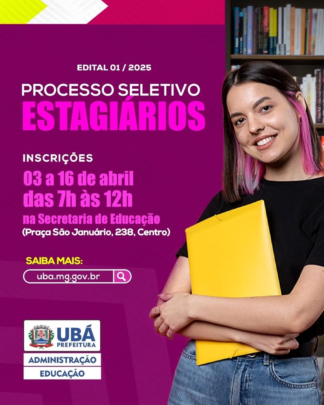 A Prefeitura Municipal de Ubá divulgou o edital do Processo Seletivo para a Concessão de Estágio a Estudantes. Os estágios oferecidos são nas Secretarias da Prefeitura Municipal de Ubá, nas Escolas Públicas vinculadas à Secretaria Municipal de Educação, na Procuradoria-Geral do Município e demais Órgãos do Município.