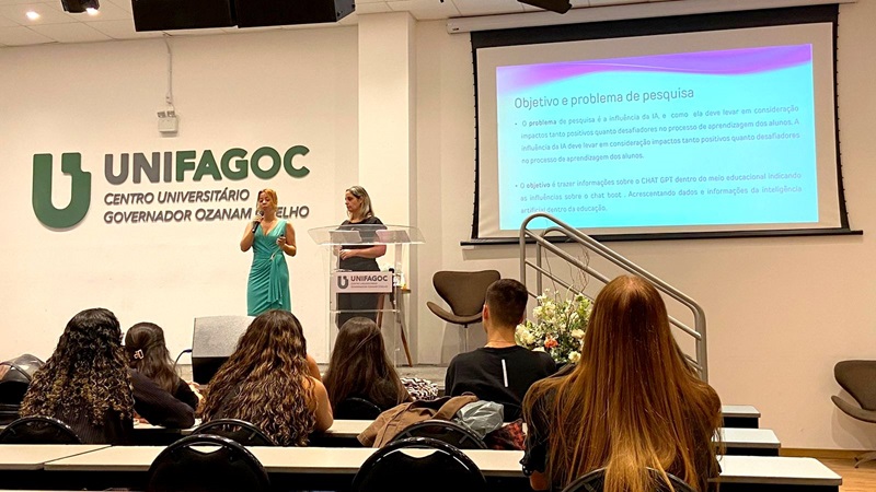 As alunas do 5º período do curso de Pedagogia do UNIFAGOC Gabriela Gonçalves Cabral e Glaucilene Regina Neves, compartilharam os resultados da pesquisa sobre a Influência do CHAT GPT na Educação Escolar durante as apresentações dos resumos expandidos, realizado no dia 25 de junho no Auditório Ary Barroso.