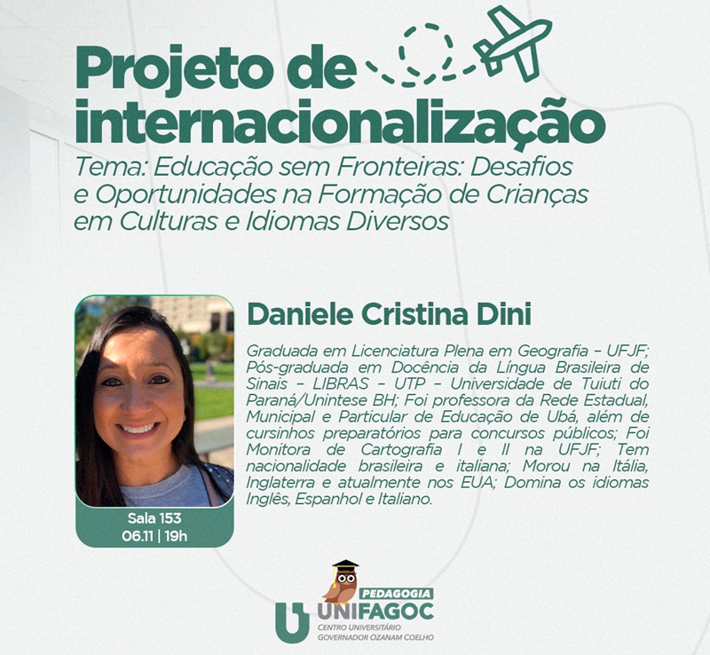 A palestra será conduzida por Daniele Cristina Dini, especialista em educação multicultural e docente com vivência em diversos países. Formada em Licenciatura Plena em Geografia pela UFJF e pós-graduada em Docência da Língua Brasileira de Sinais (LIBRAS), Daniele traz trajetória ampla na educação, tendo lecionado na Rede Estadual, Municipal e Particular de Educação em Ubá, além de cursos preparatórios para concursos públicos.