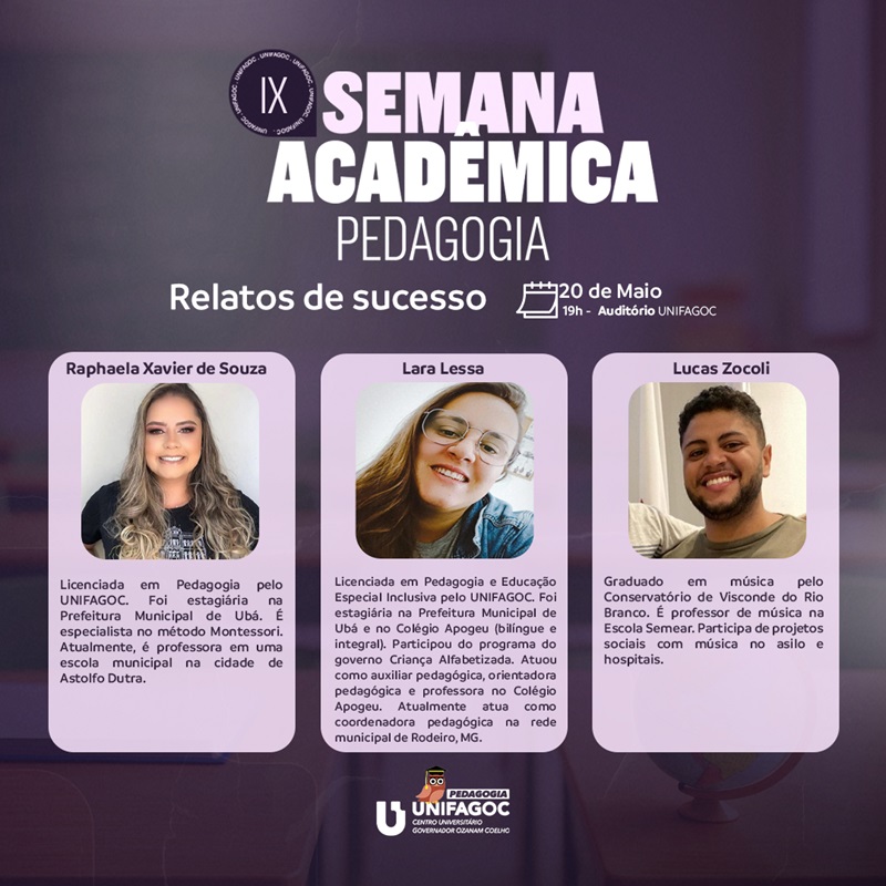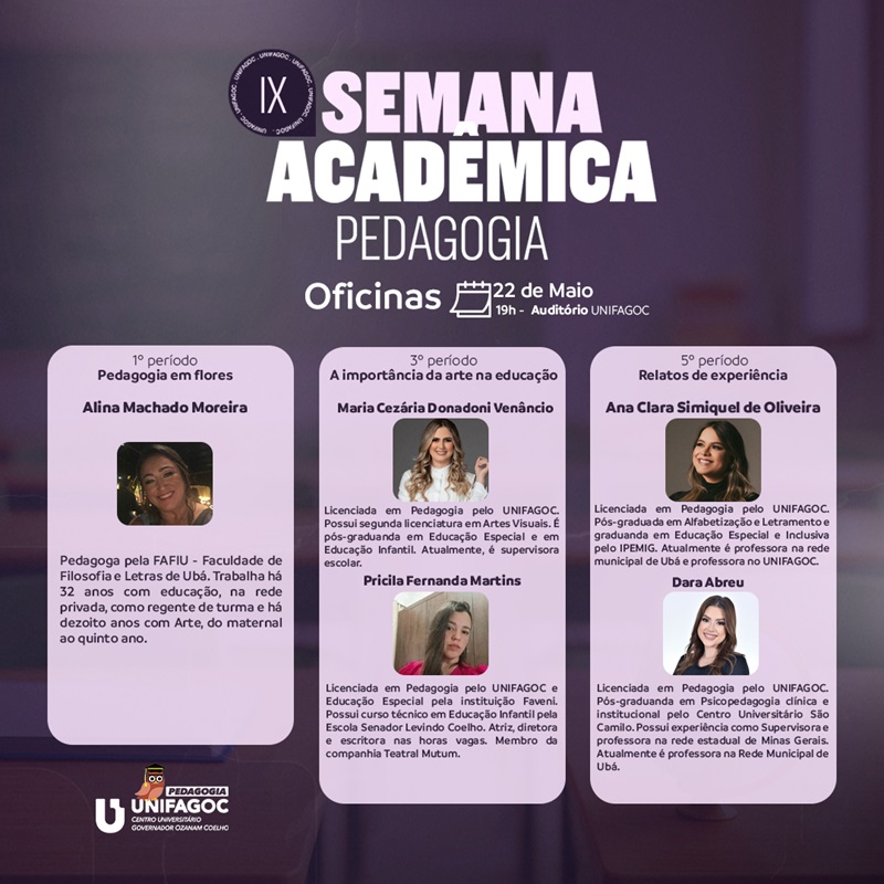 - Ana Clara Simiquel de Oliveira, que é licenciada em Pedagogia pelo UNIFAGOC. Pós-graduada em Alfabetização e Letramento e graduanda em Educação Especial e Inclusiva pelo IPEMIG. Atualmente é professora na rede municipal de Ubá e professora no UNIFAGOC.