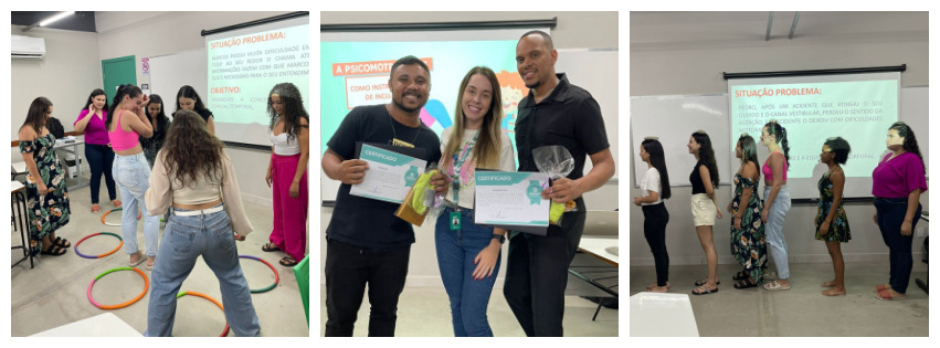 Durante a palestra, os analistas levaram diversos materiais e organizaram atividades práticas com os alunos, para que pudessem vivenciar um pouco da prática que realizam no CAEE. Os egressos destacaram que muitas crianças que apresentam dificuldade de aprendizagem, podem saná-las com a realização de bom trabalho psicomotor e, por isso, desenvolvem diversas atividades, como por exemplo, a execução de brincadeiras que utilizam como material o próprio corpo humano, brincadeiras que exigem o movimento de todos os membros, como a amarelinha, o brincar com os pés e com as mães, correr, abaixar e rolar no chão.
