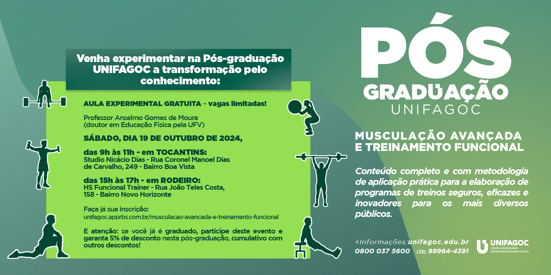 A Pós-graduação UNIFAGOC irá promover uma aula experimental do curso de Musculação Avançada e Treinamento Funcional, nas cidades de Tocantins e em Rodeiro, no dia 19 de outubro (sábado). A iniciativa é gratuita e destinada a profissionais graduados na área, que possuem interesse no curso do Centro Universitário Ubaense.