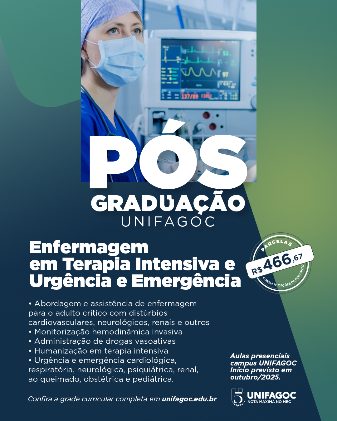 Com início em 18 de outubro de 2025, o curso de pós-graduação em Enfermagem em Terapia Intensiva e Urgência e Emergência do UNIFAGOC é excelente oportunidade para profissionais que desejam se especializar em uma das áreas mais desafiadoras da saúde, com foco no cuidado ao paciente crítico e no atendimento em situações de emergência.