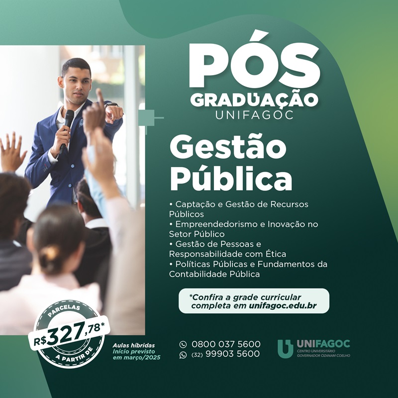 O curso de pós-graduação em Gestão Pública do UNIFAGOC tem como objetivo capacitar os profissionais para atuar na administração pública, fomentando a atuação integrada, dinâmica, produtiva e ética, promovendo o desenvolvimento sustentável e a gestão eficiente.