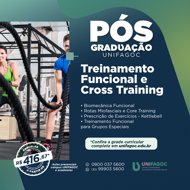 As especializações do UNIFAGOC foram construídas em diversos formatos, sendo o Treinamento Funcional e CrossTraining um curso com aulas presenciais e algumas atividades online. Assim, há conteúdos interativos disponibilizados na plataforma do UNIFAGOC para estudo assíncrono e aulas presenciais para debates, estudos de casos e outras atividades acadêmicas.