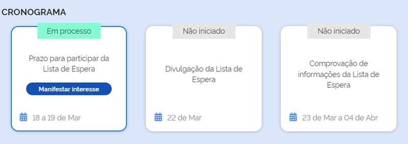 É importante destacar que as vagas para esta fase não são mais destinadas às categorias, PCD, cota ou ampla concorrência, como eram no início do processo. Nesta lista de espera, o próprio Programa fará um ranking dos candidatos para chamada, ou seja, todos estarão concorrendo às vagas.