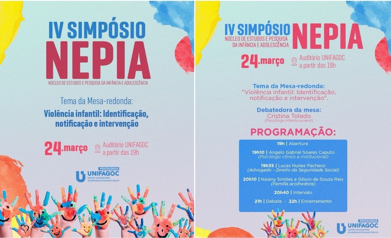 O curso de Psicologia do UNIFAGOC realiza, no dia 24 de março, às 19h, o IV Simpósio do NEPIA (Núcleo de Estudos e Práticas na Infância e Adolescência). O evento acontece no Auditório Ary Barroso e é voltado para estudantes e profissionais que atuam ou têm interesse nas áreas da infância e adolescência.