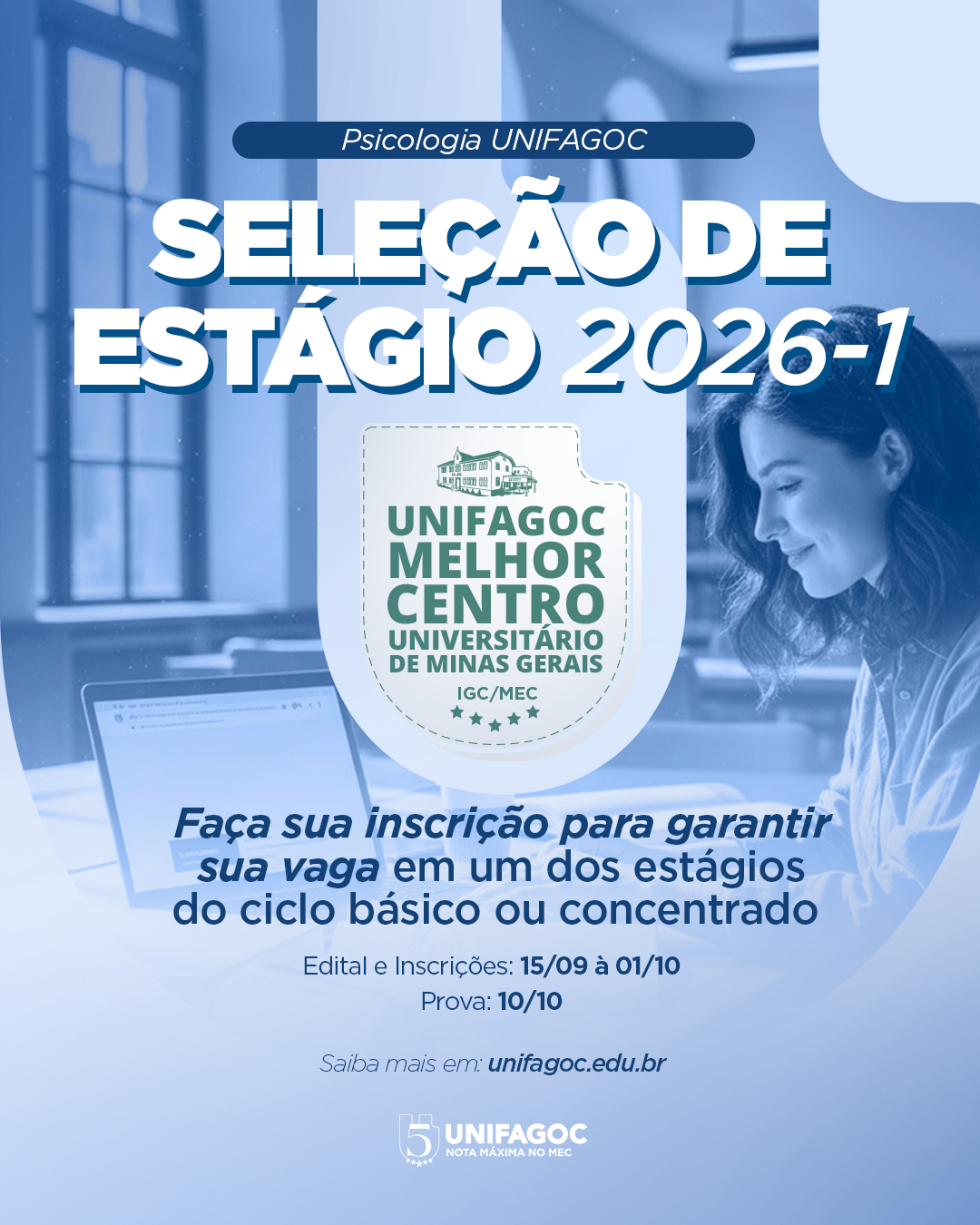O UNIFAGOC publicou o Edital nº 05/2025, que trata do preenchimento das vagas de Estágio Curricular Obrigatório do curso de Psicologia para o primeiro semestre de 2026
