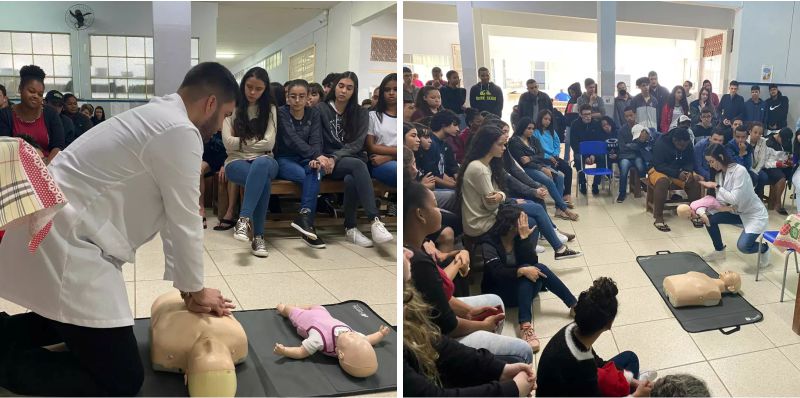Os acadêmicos de Medicina abordaram com os alunos da escola sobre ressuscitação cardiopulmonar e desobstrução de vias aéreas superiores (engasgo) em adultos, crianças e lactentes (de 1 mês a 1 ano de vida).