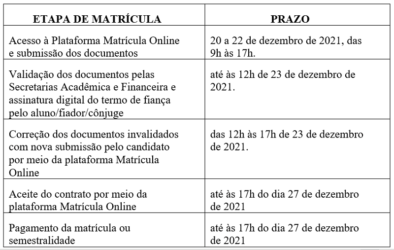 No dia 27 de dezembro, das 9h às 17h, o aprovado e convocado para matrícula deverá acessar a plataforma Matrícula Online para aceitar o contrato e efetuar o pagamento.