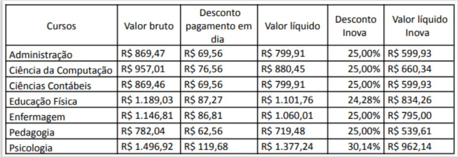 Confira na tabela abaixo a relação dos cursos e seus respectivos descontos, readequados para 2022-1, ao optar pelo INOVA: