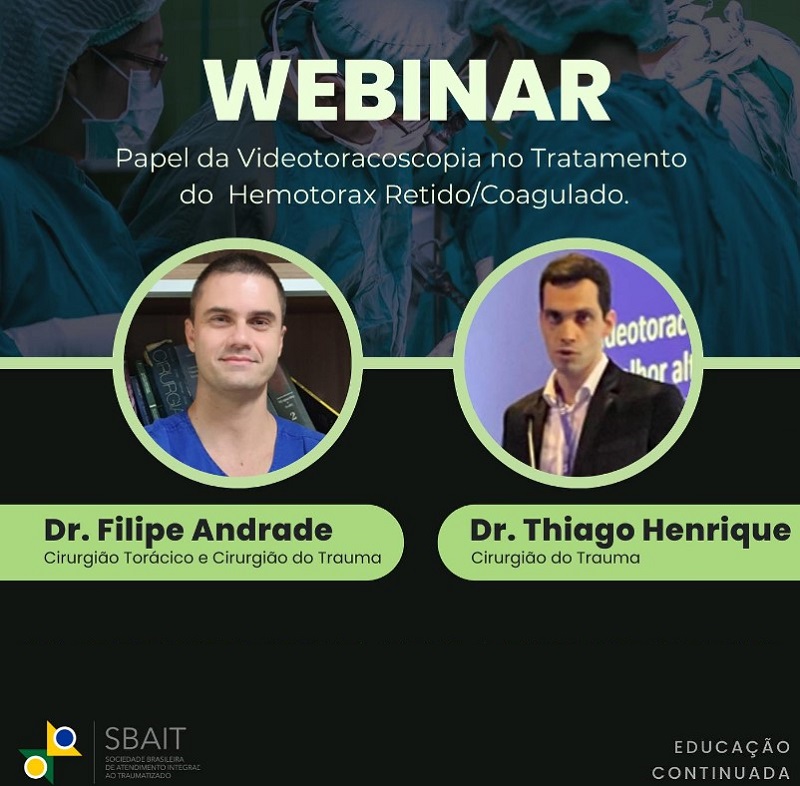 O webinar, que aconteceu no dia 20 de setembro, abordou o tema “Papel da Videotoracoscopia no Tratamentos do Hemotórax Retido/Coagulado” e também contou com a participação do Cirurgião do Trauma Dr. Thiago Henrique.