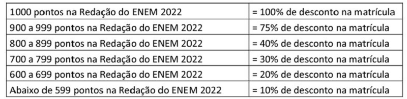 Os alunos que efetuaram a sua matrícula entre os dias 01/11/2022 e 08/02/2023, realizaram o Enem 2022 e a nota da Redação garante desconto na matrícula superior ao que o aluno já recebeu ao se matricular no UNIFAGOC antes deste regulamento, será concedido como desconto, na parcela com vencimento no mês de abril, a diferença entre o novo benefício e o desconto ofertado e recebido pelo aluno na matrícula anteriormente, conforme proporcionalidade da sua nota.