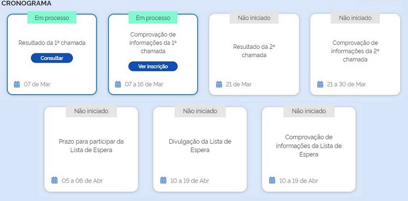 O resultado da 2ª chamada, será divulgado no dia 21 de março e a comprovação de informações desta etapa deverá ser feita até o dia 30 de março. O prazo para participar da lista de espera é de 05 a 06 de abril.