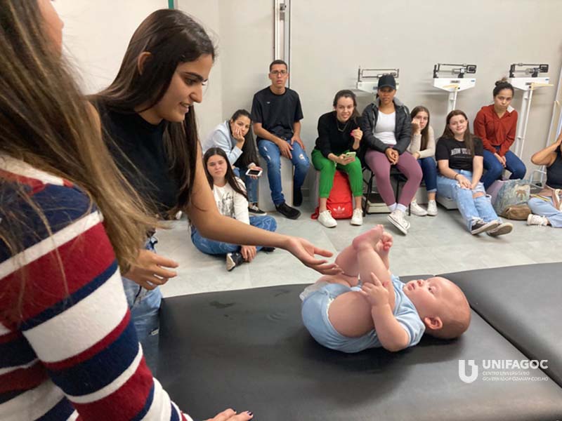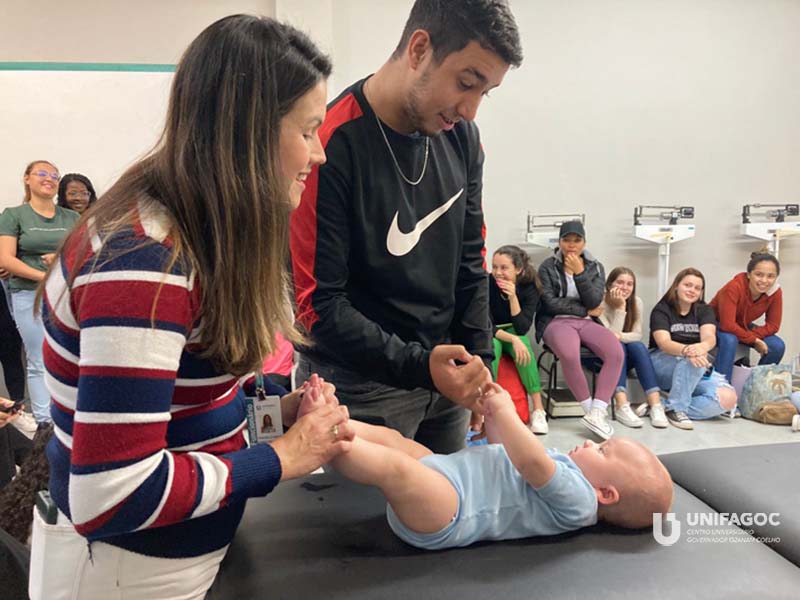 Os alunos do curso de Fisioterapia do UNIFAGOC tiveram uma aula prática da disciplina de Desenvolvimento Neuropsicosensóriomotor, com a participação de um convidado especial, o Levi, filho da acadêmica da graduação Letícia Alves. A atividade aconteceu no laboratório de Avaliações e Medidas da Instituição, no dia 24 de maio.