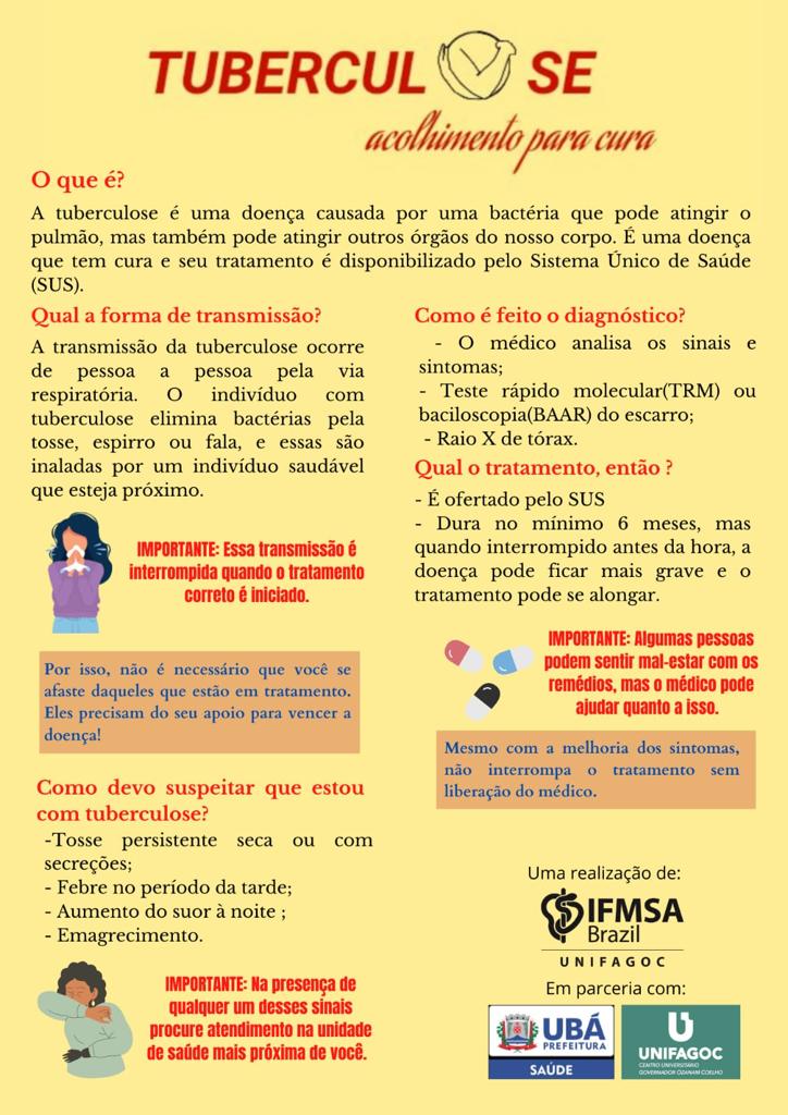 A data de 24 de março é tida como o Dia Mundial de Combate à Tuberculose e a fim de conscientizar as pessoas sobre essa doença infecciosa, que hoje ainda é um problema de saúde pública mundial, as alunas do curso de Medicina do UNIFAGOC Alíssia Baêsso, Glaucia Lemos e Sheila Oliveira desenvolveram o Projeto “Tuberculose – acolhimento para a cura”.