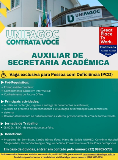 UNIFAGOC abre vaga exclusiva para Pessoa com Deficiência (PCD) – Venha fazer parte da nossa equipe!
